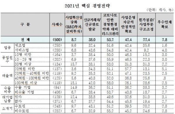 코로나19로 인해 영향이 컸던 만큼, 2021년 핵심 경영전략으로는 ▲코로나19의 영향으로 인한 경영환경 악화 대비 리스크관리 강화(53.2%)를 가장 많이 꼽았으며 ▲사업운영자금의 안정적 확보(42.4%) ▲신규거래처·판로 발굴(38.0%) 등의 순으로 조사되었다.