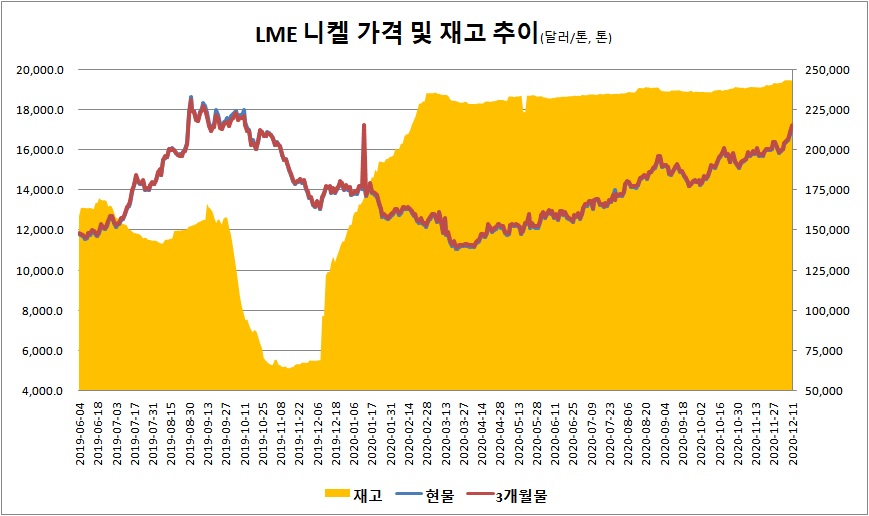 런던금속거래소(LME) 니켈 가격이 최근 7일 연속 상승세를 내달렸다. 12월 11일 기준 LME 니켈 가격은 톤당 1만7,192달러로 전일 대비 385달러 상승했다. 니켈 재고는 전일 대비 346톤 감소한 24만3,180톤을 기록했다.
