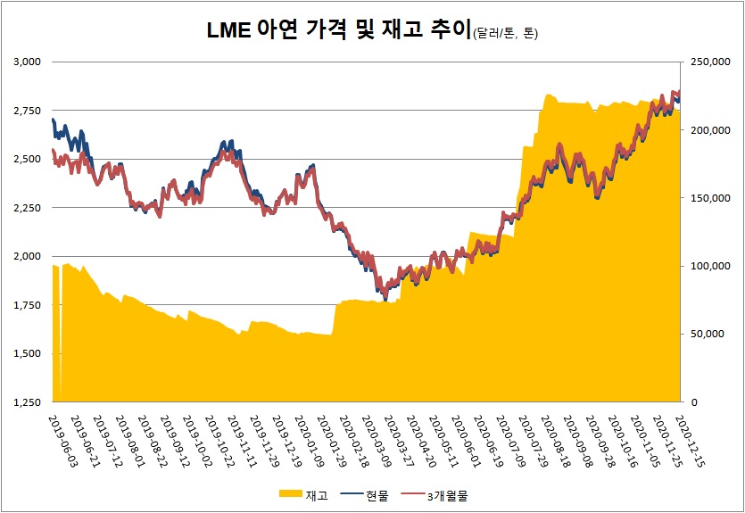 런던금속거래소(LME) 아연 가격이 다시 반등했다. 12월 15일 기준 LME 아연 가격은 톤당 2,817달러로 전일 대비 22달러 상승했다. 아연 재고는 전일 대비 150톤 감소한 21만3,425톤을 기록했다.