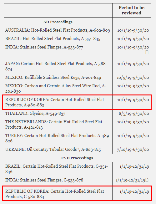 한국에 대해서는 지난 2019년 1월 1일~동년 12월 31일까지 미국으로 수출된 케이스번호 ‘C-580-884’로 등록된 특정 열연강판 제품의 CVD 조사와 2019년 10월 1일~2020년 9월 30일까지 미국으로 수출된 케이스번호 ‘A-580-883’로 등록된 특정 열연강판 제품의 AD조사를 실시할 계획이라고 공개했다.