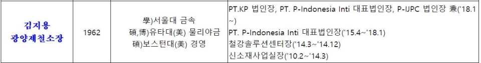 김지용 광양제철소장은 서울대 금속학과를 졸업하고, 보스턴대 경영학 석사, 유타대 물리야금학 석·박사 학위를 받았다. 신소재사업실장, 철강솔루션센터장 등을 지냈으며 2018년 1월부터 PT.KP 법인장, PT. P-Indonesia Inti 대표법인장, P-IJPC 법인장을 맡아왔다.
