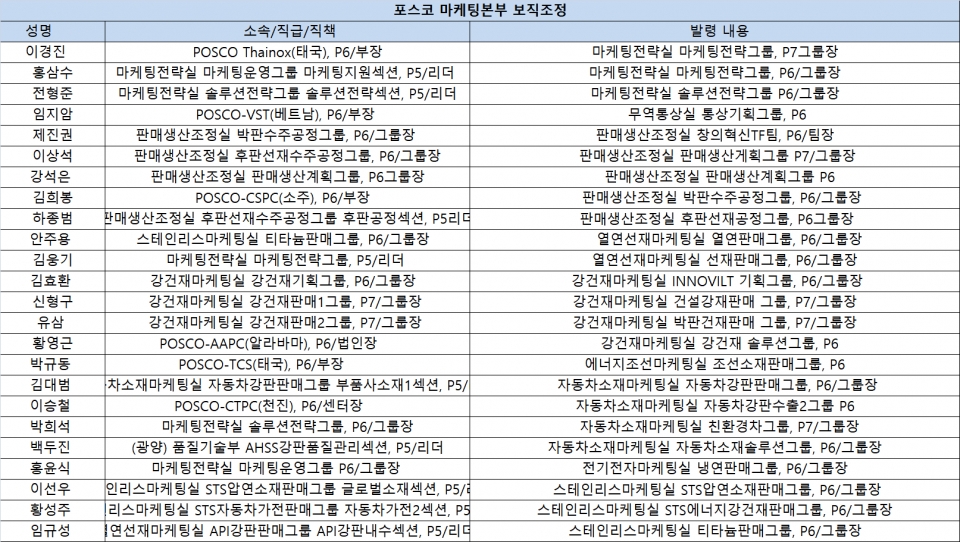 포스코가 21일 정기 인사를 단행했다. 이번 인사는 내년 1월 4일부로 적용된다. 내용은 다음과 같다. 박재철 기자 parkjc@snmnews.com 다른 기사 보기 관련기사 강지현 영남대 교수, '2021 포스코사이언스펠'로 선정 포스코인터내셔널, 2021년 조직 개편 및 보직변경 실시 포스코, ‘포스맥’으로 그린 뉴딜의 한축 수상태양광 수요 확보 포스코 광양제철소, 철강인들의 2020년 정년퇴직 행사 포스코 앞서 中·印尼 STS 반덤핑 반대 시위 (인사) 포스코 상무보 신규선임 포스코, 인공지능·빅데이터 아카데미 교육생 모집 (인사) 와이케이스틸 임원 인사 포스코 포항제철소, 로봇으로 안전·효율 확보 저작권자 © 철강금속신문 무단전재 및 재배포 금지