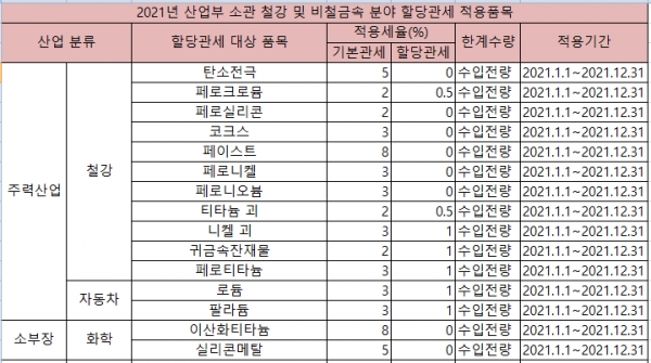 올해 철강 및 비철금속 관련 수입제품 26개 품목 등 총 60개 품목에 대해 할당관세가 적용된다.