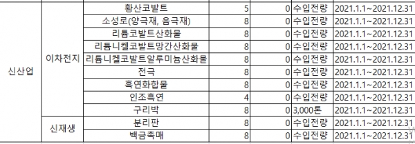 이차전지 분야에서는 황산코발트, 소성로(양극재, 음극재), 리튬코발트산화물, 리튬니켈코발트망간산화물, 리튬니켈코발트알루미늄산화물, 전극, 흑연화합물, 인조흑연, 구리박 등 9개 품목, 신재생에너지 분야에서는 분리판, 백금촉매 등 2개 품목이 적용 대상이다.