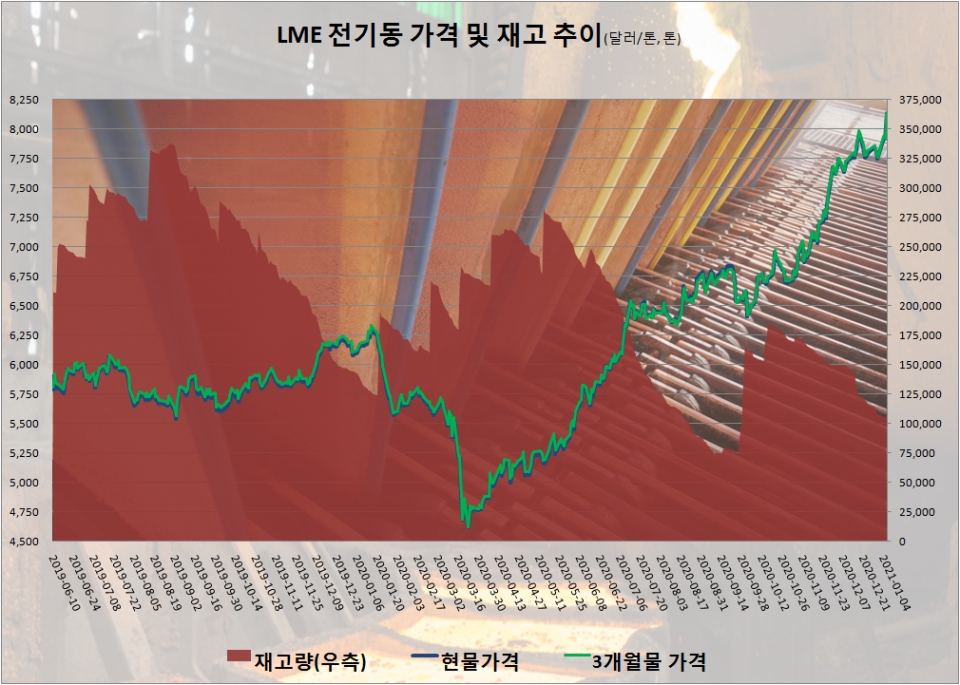 지난 6일 런던금속거래소(LME)에서 거래된 전기동 현물가격은 전일대비 215.5달러 오른 톤당 8,129.5달러를, 3개월물 가격은 205달러 상승한 8,127.5달러를 각각 기록했다. 전기동 가격이 톤당 8,100달러를 넘어선 것은 지난 2013년 1월 이후 처음이다.