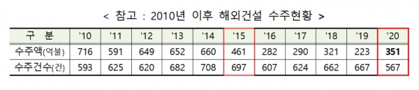 국토교통부(장관변창흠)와 해외건설협회(회장 이건기)는 2020년 해외건설 수주액이 지난해 연초에 설정했던 목표액 300억달러를 크게 초과한 351억달러로 집계됐으며, 이는 최근 5년간 수주실적 중 가장 높은 수치를 기록했다고 밝혔다.