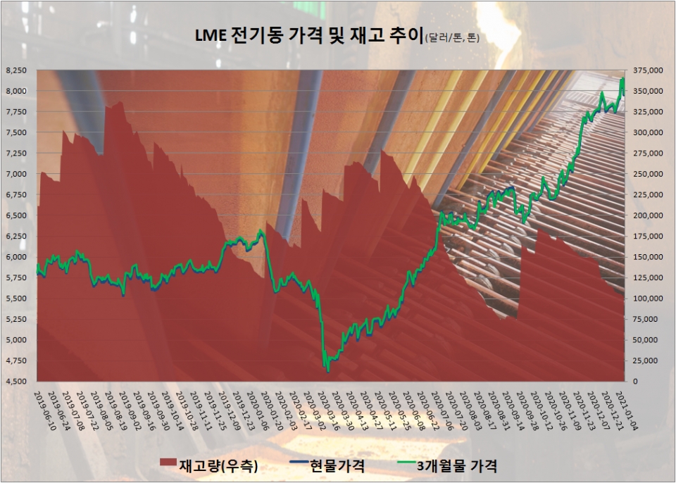 지난 11일 런던금속거래소(LME)에서 거래된 전기동 현물가격은 전일대비 194.5달러 떨어진 톤당 7,951.5달러를, 3개월물 가격은 193달러 하락한 7,967달러를 각각 기록했다.