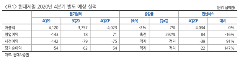 현대차증권 박현욱 애널리스트는 현대제철의 2020년 4분기 별도 경영실적 영업이익이 706억원을 기록할 것이라고 주장했다. 이는 지난해 4분기 영업이익이 전년 동기 1,430억원 적자에서 흑자로 전환, 그리고 직전 분기 대비 292% 증가할 것 예상한 수치다.