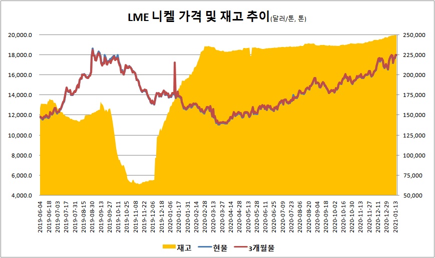 런던금속거래소(LME) 니켈 가격이 4일째 상승세를 내달렸다. 1월 15일 기준 LME 니켈 가격은 톤당 1만7,970달러로 전일 대비 19달러 상승했다. 니켈 재고는 전일 대비 90톤 감소한 24만9,306톤을 기록했다.