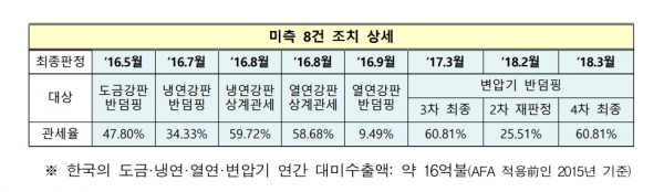 산업통상자원부에 따르면 WTO는 21일 한국산 철강·변압기에 대해 AFA를 적용해 고율의 반덤핑 및 상계관세를 부과한 미국 측의 조치 8건 모두에 대해 한국 정부의 손을 들어줬다.