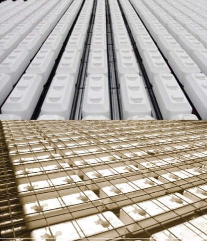 중공용데크는 경량체와 철근이 맞닿지 않도록 설치돼 철근과 콘크리트의 일체 거동을 확보하고, 콘크리트 양생이 완료된 중공슬래브의 강도 저하를 방지할 수 있는 새로운 구조의 경량체가 구비된 제품이다.