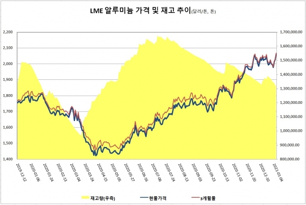 한편, 1월 LME 알루미늄 평균 가격은 톤당 2,006.1달러로 전월 대비 11.8달러 하락했고, 3개월물은 톤당 2,007.5달러로 21.4달러 내렸다.