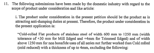 최근 인도 무역구제총국(DGTR)은 너비 600mm~1,250mm 규모(Mill Edge의 경우 폭 +30mm, Trimed Edge의 경우 +4mm)의 수입산 스테인인리스 냉간압연강판에 대한 연례 AD 조사 최종 결과를 발표했다. 이번 조사는 인도 Jindal Stainless Steel Limited 등 현지 스테인리스 업계가 지난해 12월 연장이 결정된 수입산 STS에 대해 새로운 과세를 부과해 달라고 청원해서 이뤄졌다.