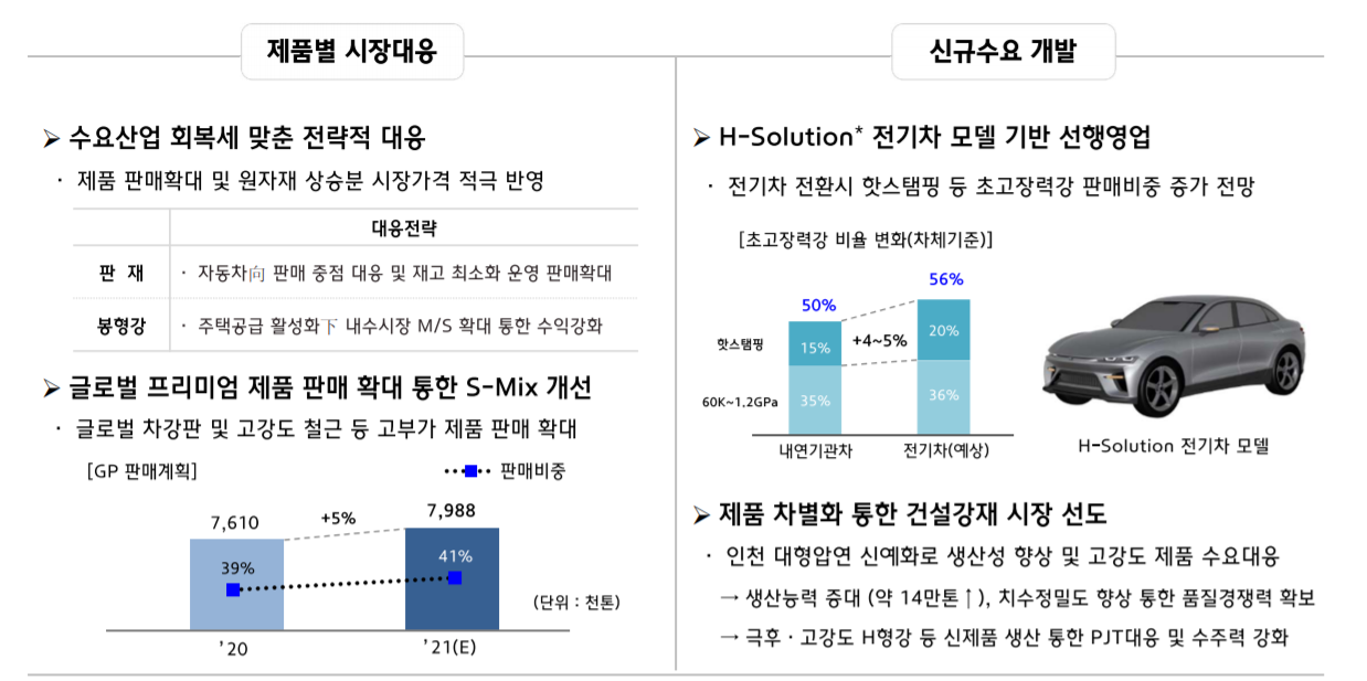 글로벌 차강판 및 고강도 철근 등 고부가 제품 판매를 2020년 761만톤에서 2021년 798만8천톤까지 확대한다는 방침이다.