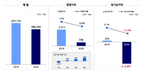 지난해 연결기준 매출액은 전년 대비 12.1% 감소한 18조234억원, 영업이익은 78.0% 감소한 730억원을 기록했다. 영업이익률은 지난해 같은 기간보다 1.2%p 낮아진 0.4%를 기록했다.