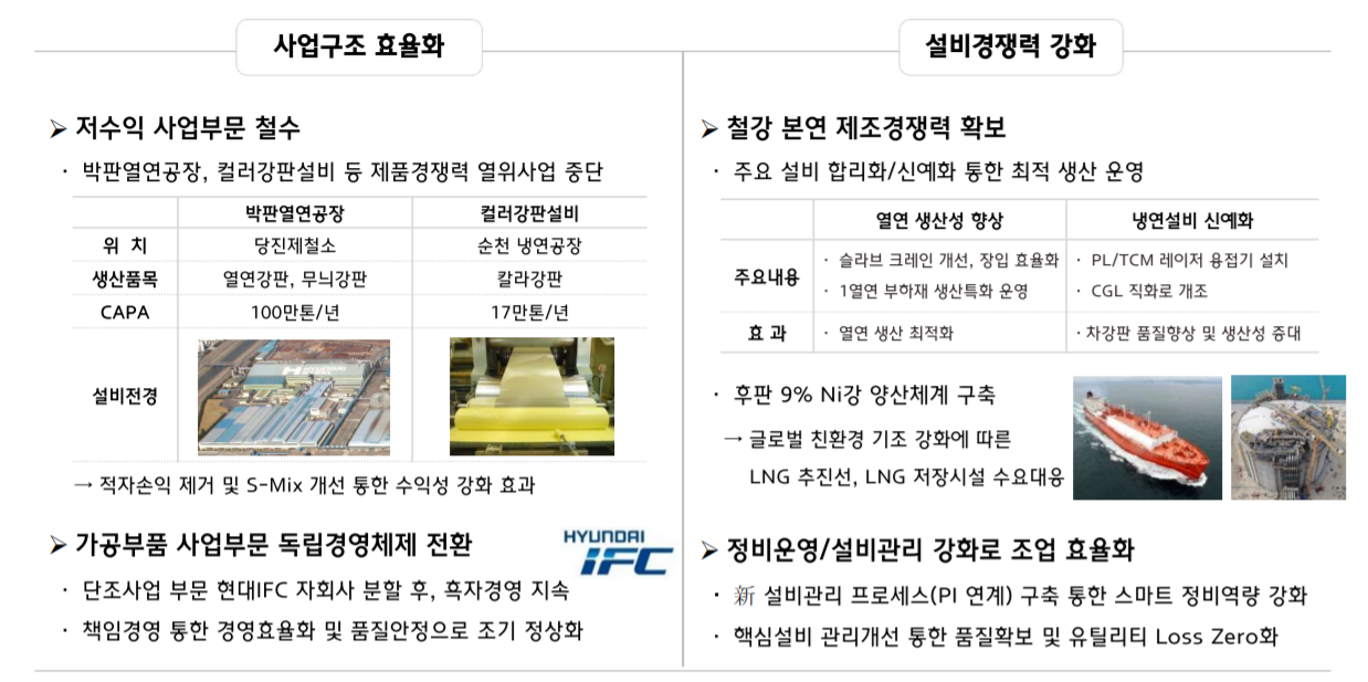 현대제철은 지난해 사업구조 효율화를 위해 열연강판과 무늬강판을 생산하는 당진제철소 박판열연공장 사업과 칼라강판을 생산하는 순천 냉연공장 칼라강판설비 가동을 중단했다. 제품경쟁력 열위 사업으로 평가하고 내린 결정으로, 적자 손익 제거 및 세일즈믹스 개선 통해 수익성이 강화될 것으로 기대된다.