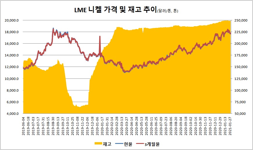 런던금속거래소(LME) 니켈 가격이 그간의 하락을 마치고 반등했다. 1월 29일 기준 LME 니켈 가격은 톤당 1만7,727달러로 전일 대비 65달러 상승했다. 니켈 재고는 전일 대비 같은 24만8,886톤을 유지했다.