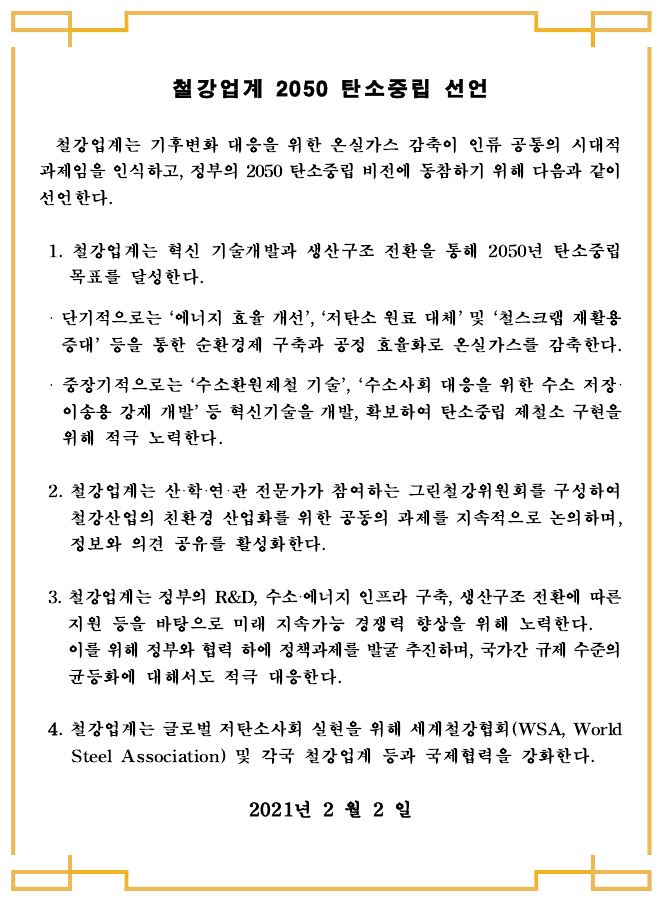 공동선언문에는 △새로운 기술 개발과 생산구조 전환을 통한 탄소배출 감축 노력 △그린철강위원회를 통한 정보와 의견 공유 활성화 △정부 정책과제 발굴 및 제언과 미래 지속가능 경쟁력 향상 추진 등 철강업계의 주요 실천과제가 담겼다.