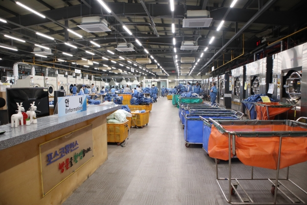 포스코휴먼스는 이번 리모델링을 통해 지하 1층이던 기존의 세탁 공장동 (1284㎡)을 지상 1층까지 확장(1,866㎡) 했으며, 확장된 작업공간에 세탁물을 자동으로 옮길 수 있는 컨베이어와 에어 덕트 설비를 도입했다.