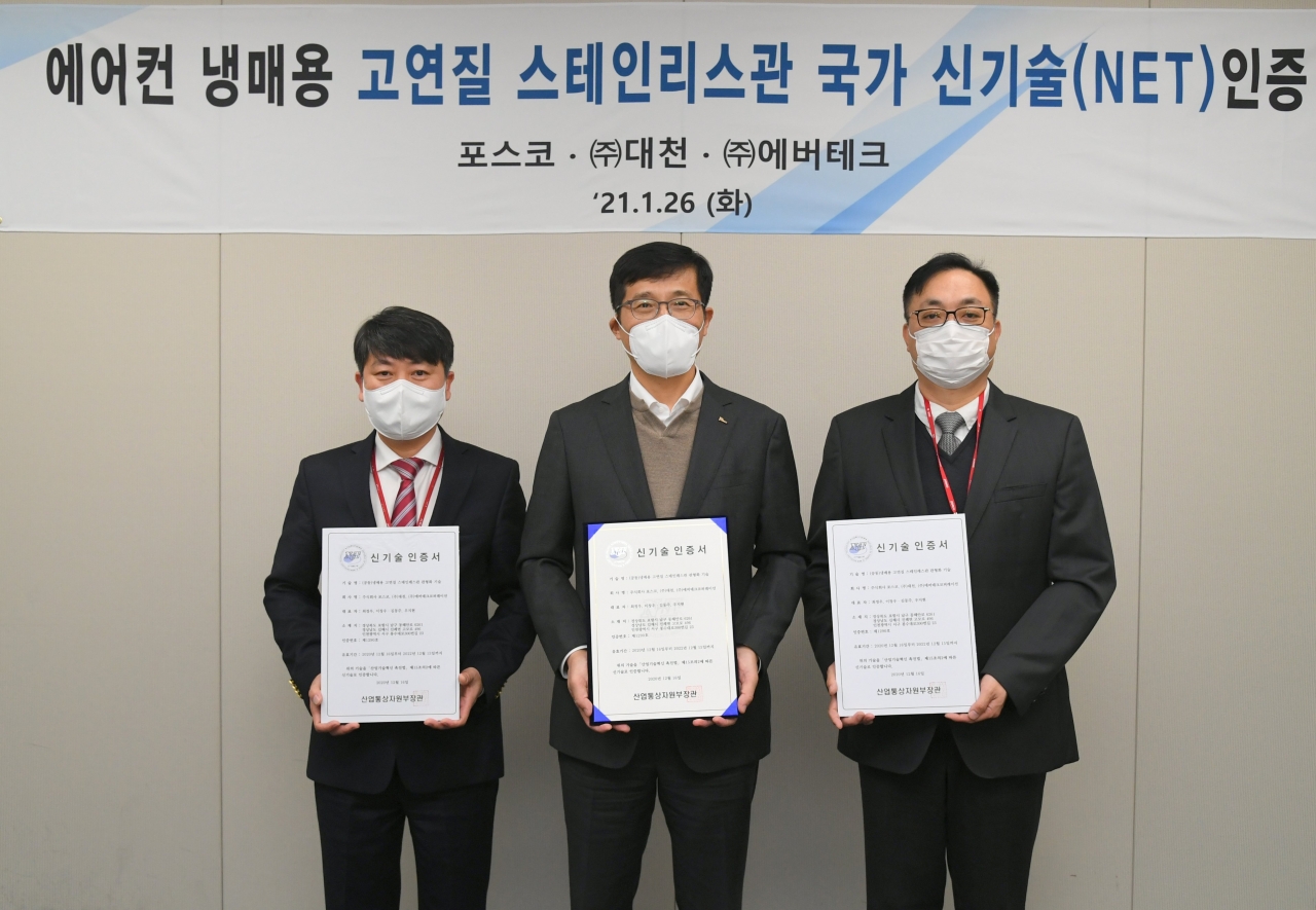 이번에 획득한 국가 신기술은 포스코의 고품질 철강, 대천의 파이프 조관 및 열처리, 에버테크코퍼레이션의 무용접 후크 조인트 등 3사의 기술을 조합한 ‘냉매용 고연질 스테인리스관 관형화 기술'이다. 내식성이 우수한 고연질 스테인리스관을 에어컨 냉매 배관으로 사용함으로써 기존의 동관을 대체할 수 있다.