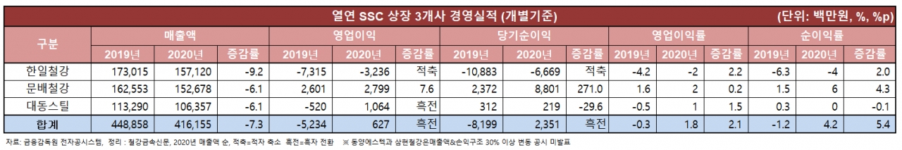 이들 열연 SSC 3사는 매출액 및 손익구조의 급격한 변동으로 다른 2개사보다 빠르게 개별 경영실적을 발표했다. 이들은 코로나19로 인한 판매 감소로 전체 매출이 전년보다 6억~16억(6~9%) 감소한 가운데서도 판관비 절감 노력과 하반기 유통가격 상승, 자회사 및 유통 외 사업실적 상승 등으로 수익성 개선에 성공했다.
