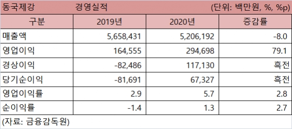 이에 동국제강의 2020년 매출액영업이익률은 5.7%를 기록해 2019년의 2.9% 대비 2.8%p 증가했으며, 매출액순이익률 또한 1.3%를 기록해 2019년의 -1.4% 대비 2.7%p 증가한 것으로 집계됐다.