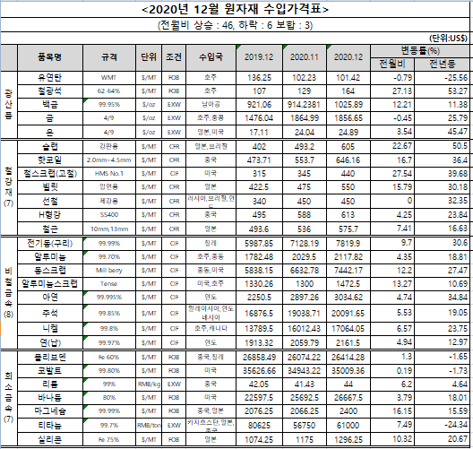 비철금속의 경우 전기동과 동스크랩은 경기회복 기대와 전기차 등 친환경 자동차 부문의 수요 확대로 가격이 상승했고, 알루미늄과 알루미늄스크랩은 중국 중심 글로벌 알루미늄 수요 회복 지속에 따라 가격이 상승했다. 아연은 글로벌 광산 생산 감소 및 대규모 인프라 투자 가능성으로 가격 상승세가 지속됐고, 주석은 글로벌 반도체 시장 호황과 공급 감소, 수요 증가로 가격이 상승했다. 니켈은 공급 차질 우려와 수요 증가 전망에 가격이 상승했고, 연(납)은 한파 예보와 최근 글로벌 자동차 시장 판매량 증가에 따라 가격이 상승했다.