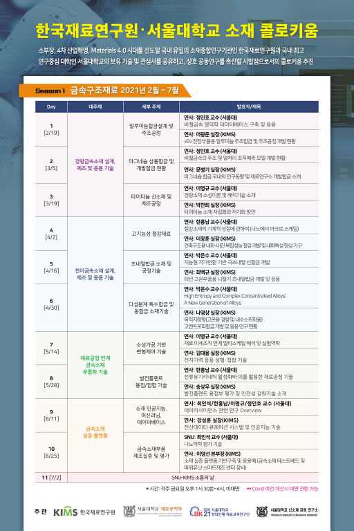 재료연구원 연구기획조정본부와 서울대학교 신소재공학과가 주관 및 주최하는 이번 소재 콜로키엄은 2021년~2023년 간 연 1회 시즌제로 운영될 예정이며, 올해는 ‘구조금속재료 분야’에 대한 프로그램을 확정하고 19일에 그 막을 올렸다.