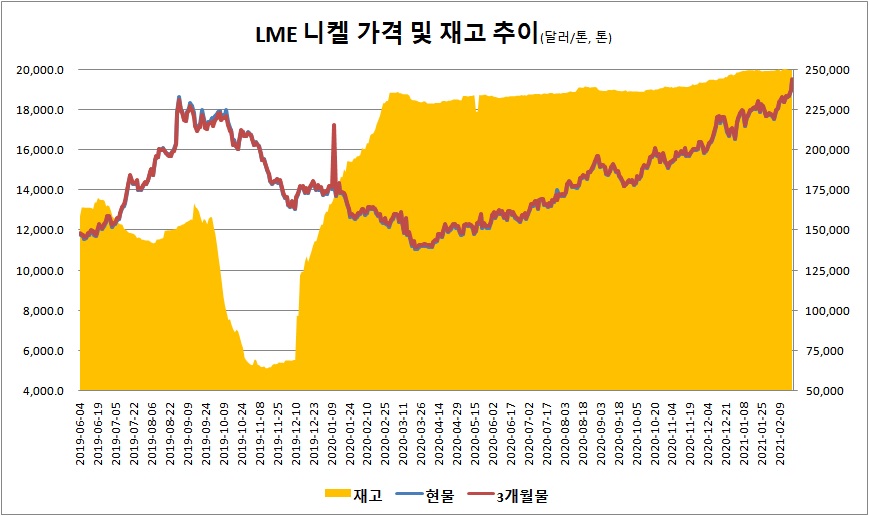 런던금속거래소(LME) 니켈 가격이 5일 연속 상승세를 내달렸다. 2월 19일 기준 LME 니켈 가격은 톤당 1만9,496달러로 전일 대비 530달러 상승했다. 니켈 재고는 전일 대비 30톤 감소한 24만9,480톤을 기록했다.