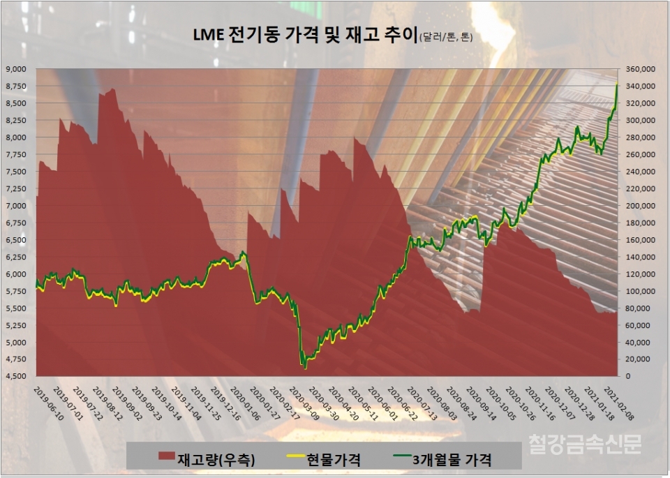 이미 런던 오전거래에서 심리적 저항선으로 여겨지던 톤당 8,700달러를 단숨에 넘어섰으며, 뉴욕 외환시장에서 달러가 이틀 연속 하락하면서 오후 들어 전기동 가격 상승세가 더욱 커졌다. 이로 인해 현물가격은 장중 한 때 9,034.25달러까지 치솟았다가 다시 저항을 느끼며 소폭 하락하여 마감종가는 톤당 8,900달러 후반대를 기록했다.