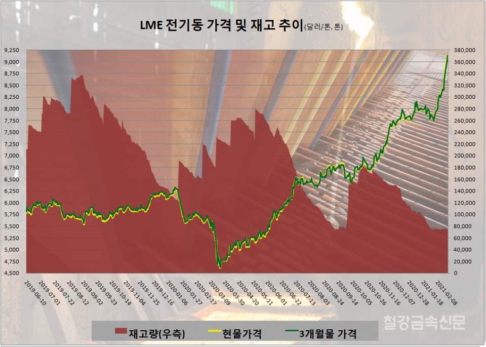 또한 이날 전기동 시장은 중국이 춘절에서 돌아온 이후 4일만에 한 선물회사에서 10억달러 규모의 신규 매수 포지션을 쌓았다는 뉴스가 나오는 등 최근 상승세에 투기적인 움직임이 더해지는 모습을 보였다. 현재 전기동 현물 수급이 타이트한 상황이고 글로벌 경제는 회복 가능성을 높이고 있다는 점이 가격 상승의 기본 배경이 되고 있다.