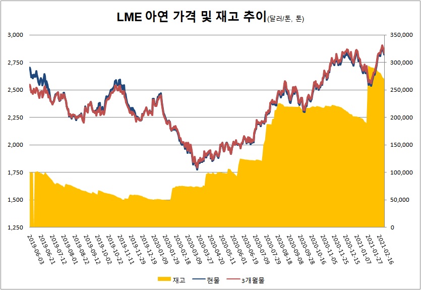 런던금속거래소(LME) 아연 가격이 추가 하락했다. 2월 24일 기준 LME 아연 가격은 톤당 2,822.5달러로 전일 대비 37달러 하락했다. 아연 재고는 전일 대비 1,425톤 감소한 27만525톤을 기록했다.