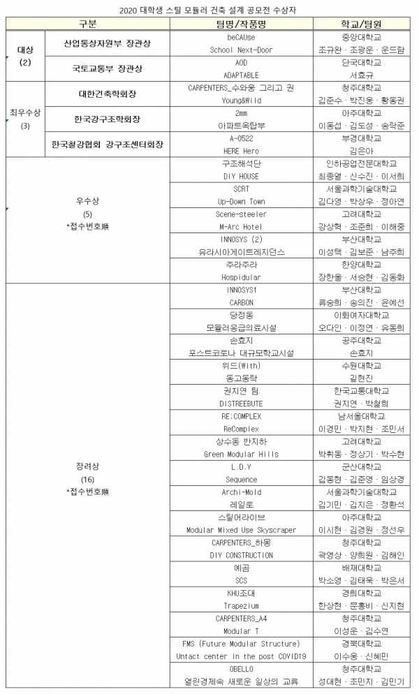 대상(부상 500만원)은 총 두 작품으로 산업통상자원부장관상에 beCAUse팀(중앙대학교 조규완·조광운·운드람)의 'School Next-Door'가, 국토교통부장관상에 AOD팀(단국대학교 서호규)의 'ADAPTABLE'이 각각 선정됐다. 최우수상(부상 300만원) 세 작품에는 대한건축학회장상에 수와웅 그리고 권팀(청주대학교 김준수·박진웅·황동권), 한국강구조학회장상에 2mm팀(아주대학교 이동섭·김도성·송락준), 한국철강협회 강구조센터회장상에 A-0522팀(부경대학교 김은아)이 각각 선정됐다. 이 밖에도 우수상(부상 각 100만원) 5개팀 작품과 장려상에 16개팀 작품이 각각 선정됐다.