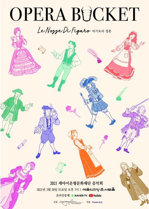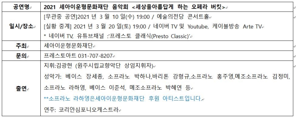 세아이운형문화재단은 예술의전당 콘서트 홀에서 '2021 세상을 아름답게 하는 오페라 버킷' 음악회를 무관중으로 개최하고 20일 저녁 7시 네이버TV와 유튜브 등을 통해 온라인 중계 한다고 밝혔다.