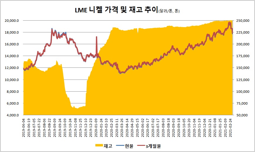 런던금속거래소(LME) 니켈 가격이 추가 하락했다. 3월 3일 기준 LME 니켈 가격은 톤당 1만7,802달러로 전일 대비 778달러 하락했다. 니켈 재고는 전일 대비 2,742톤 증가한 26만1,534톤을 기록했다.