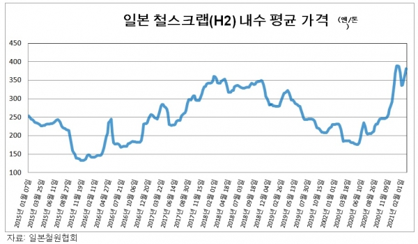 일본 철스크랩 평균 가격이 4주 연속 상승하면서 국내 철스크랩 가격 상승을 부채질하고 있다.