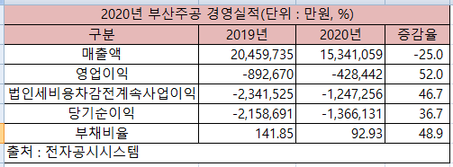 부산주공의 공시에 따르면 회사는 지난해 매출액은 전년 대비 25.0% 감소한 1,534억1,059만원을 기록했다. 하지만 영업이익은 전년 대비 52.0% 감소한 42억8,442만원 적자, 법인세비용차감전계속사업이익은 전년 대비 46.7% 감소한 124억7,256만원 적자, 당기순이익은 36.7% 감소한 136억6,131만원 적자를 기록했다.