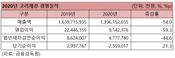 회사는 코로나19에 따른 판매량 감소와 단가 하락으로 영업이익이 줄었다고 설명했다.
