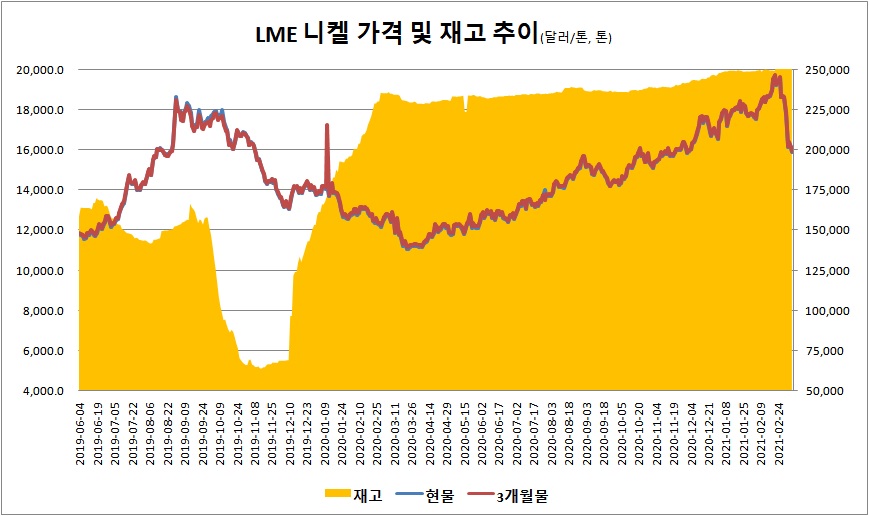 런던금속거래소(LME) 니켈 가격이 추가 하락했다. 3월 9일 기준 LME 니켈 가격은 톤당 1만5,907달러로 전일 대비 208달러 하락했다. 니켈 재고는 전일 대비 24톤 감소한 26만352톤을 기록했다.