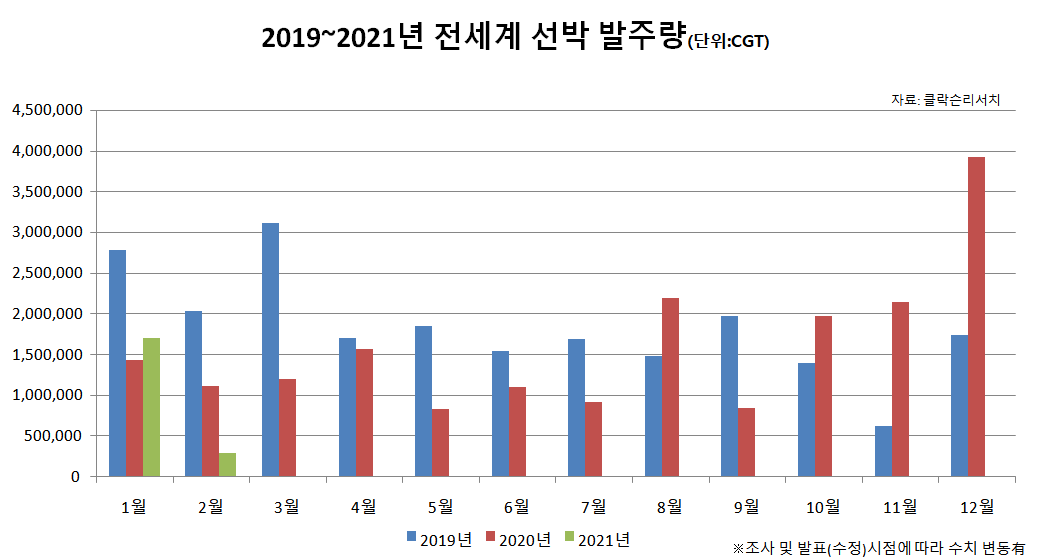조선해운 분석기관 클락슨 리서치에 따르면 지난 2월 세계 선박 발주량은 약 282만CGT(표준화물선 환산 톤수)을 기록했다. 전월 대비 66%, 전년 동월 대비 154% 급증했다. 또한 2019년 1월 이후 월별 발주량 통계에서 3번째(2020년 12월 392만CGT, 2019년 3월 311만CGT)로 높았다.