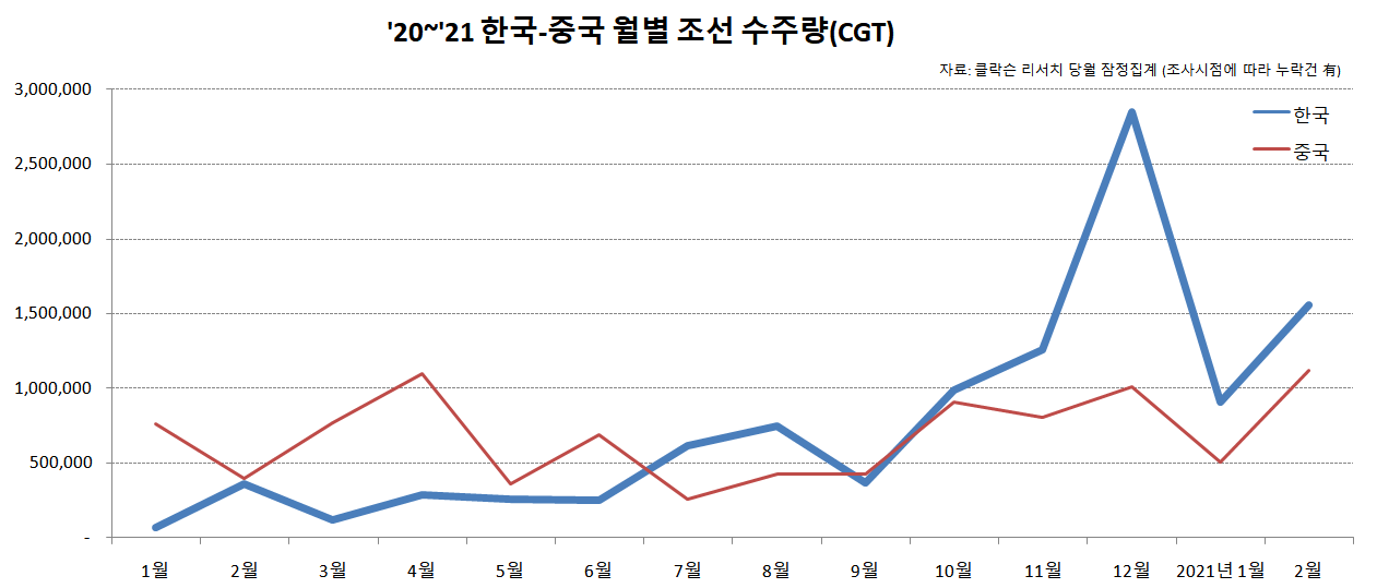 한국 조선업계의 경우 2월 전체 발주량의 절반이 넘는(시장 점유율 56%) 156만CGT, 43척을 수주했다. 뒤이어 조선업 경쟁국인 중국이 112만CGT, 43척으로 2위를, 일본이 6만CGT, 2척으로 3위를 기록했다. 한국 조선업과 중국 조선업의 올해 시장점유율 격차는 16%p로 벌어졌다.