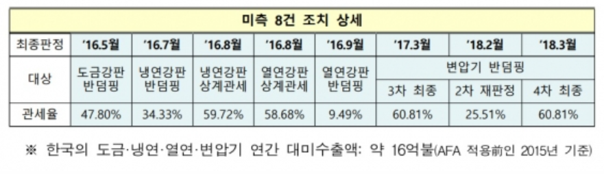 지난 1월, WTO 1심 재판부(패널)는 한국산 철강·변압기에 대해 '불리한 가용 정보'(AFA) 조항을 적용해 고율의 반덤핑 및 상계 관세를 부과했던 미국 측의 조치 8건 모두에 대해 “세계 공정무역 질서에 부합하지 않는다”며 우리 정부의 손을 들어줬다.