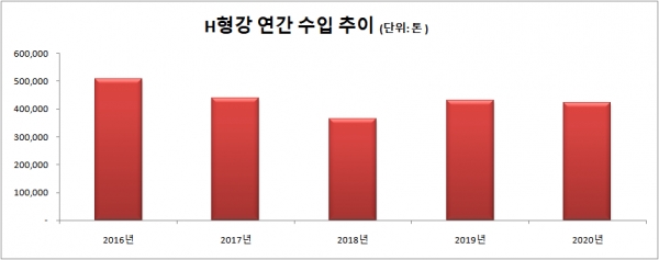 같은 기간 H형강 수입 또한 유사한 수준을 기록했다. 2016년부터 지난해까지 5년 평균 수입량은 약 43만톤 수준을 기록했으며, 2016년의 경우 50만톤을 소폭 넘기는 실적을 기록했다. 2018년 수입의 경우 연간 36만톤으로 저점을 형성했으나, 2017년과 2019~2020년 수입은 각각 42만~43만톤 수준을 나타냈다.