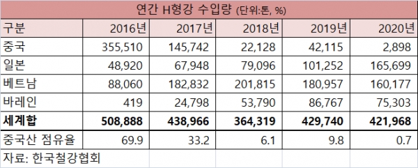 지난 2015년 7월 이후 중국 H형강에 대해 덤핑방지관세와 최저 수출가격 약속 등이 시행되며, 중국 제품 수입은 크게 줄었다. 이에 2016년 연간 50만톤 수입 가운데 중국 제품 수입은 약 35만톤으로 69.9% 비중을 차지했으나, 2017년 14만톤 수입으로 수입 비중은 33% 수준까지 하락했다. 더욱이 지난해 중국 제품 수입은 연간 1만톤에도 미치지 못하며 수입 H형강 가운데 1% 비중도 차지하지 못했다.
