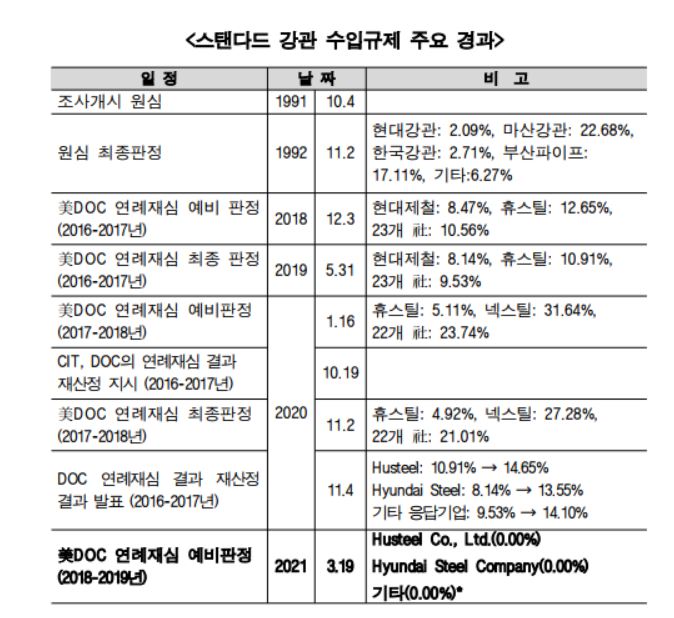 한국무역협회에 따르면 한국산 스탠다드강관(Circular welded non-alloy steel pipes)에 대한 반덤핑 연래재심 예비판정(2018년~2019년)에서 미국 시장 가격보다 낮은 가격으로 유입되지 않고 있다고 밝혔다. 이에 따라 미 상무부는 국내 업체에 대해 0%의 관세를 예비판정한다고 전했다.