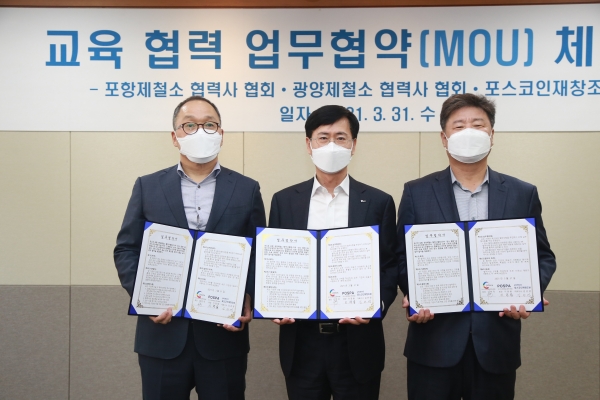 포스코인재창조원(원장 김관영)은 31일, 포항, 광양 제철소 협력사협회와 ‘교육협력 협약’ 을 체결했다. 협약식에는 포스코인재창조원 김관영 원장, 포항 제철소 협력사협회 김헌덕 회장, 광양 제철소 협력사협회 이광용 회장이 참석했다.