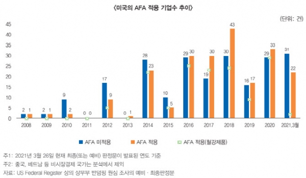한국무역협회 국제무역통상연구원이 2일 발표한 ‘바이든 행정부의 무역구제정책 전망: 반덤핑 조사관행 현황을 중심으로’에서 미국 반덤핑 조치 관련 지난 10여 년간의 데이터를 분석한 결과, 오바마 행정부 시절 조사당국의 재량권을 확대하는 방향으로 반덤핑 절차법이 개정된 이후 실제로 ‘불리한 가용정보’(AFA), ‘특별시장상황’(PMS)과 같은 문제적 기법들이 빈번히 사용되고 반덤핑 관세율도 이전에 비해 훨씬 상승한 것으로 나타났다.