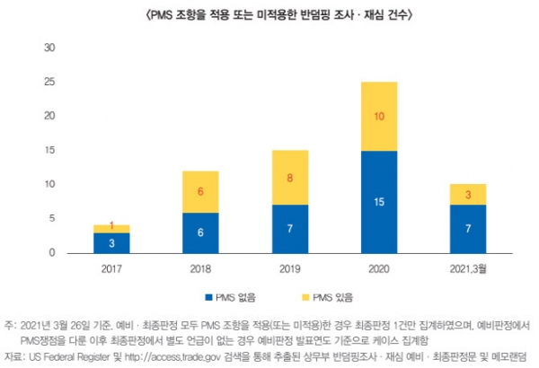 미국이 한국 기업에 대해 처음으로 적용했던 특별시장상황(PMS) 규정의 경우 상무부가 수출국 국내시장에 대한 상황 판단에 있어 폭넓은 재량권을 행사해 수출업체의 덤핑마진을 크게 상승시킨 것으로 확인됐다. PMS 규정은 한국산 제품을 시작으로 여러 국가와 품목으로 확대 적용되기 시작해 2020년에는 한국인도·터키, 독일 등 4개국 10개 품목 조사에 적용된 것으로 나타났다.