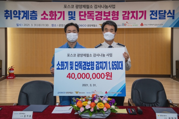‘사랑의 소화기’ 보급 사업을 위해 광양제철소는 총 4,000만원 상당의 금액을 지원하고 전남사회복지공동모금회를 통해 사랑나눔복지재단에 기탁하였다.