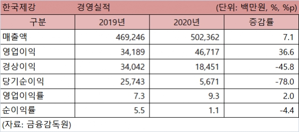 이에 한국제강의 지난해 매출액과 영업이익은 전년 대비 모두 늘어난 것으로 나타났다. 특히 2020년 매출액영업이익률은 9.3%를 기록해 전년 7.3% 대비 2%p 증가한 것으로 집계됐다.